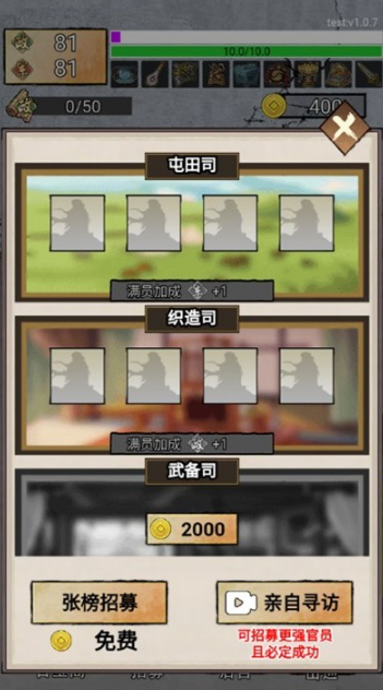 1、游戏中的官员选拔 系统 独具匠心,玩家可以通过面试、 考试 等方式选拔出最优秀的官员,为国家的发展做出贡献。