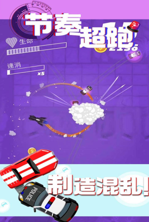 节奏 超跑官方版 游戏 里面玩家可以与紧追不舍的警察较量!展示 驾驶 技巧,用计摆脱他们! 点击 以左右转向,让敌人相互碰撞,增加连击数,获取更多分数!务必小心不要受到过多伤害,否则就会失败!