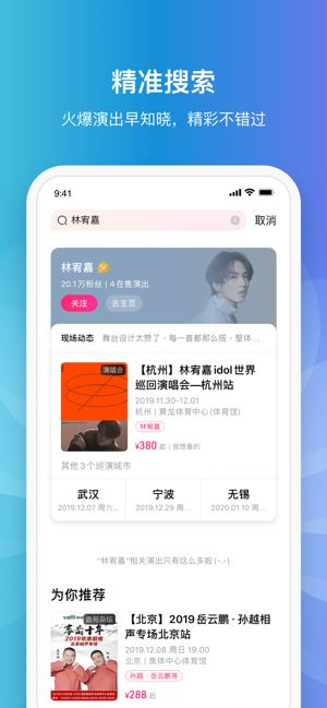 2、实时了解最新的演出信息,实时更新推送,还可关注自己喜欢的明星。