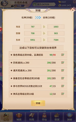 :仙缘*10000、精炼石*500、中级装备礼包*1、高级装备礼包*1白嫖突破100级的难点在于宝石等级,先上突破的属性图