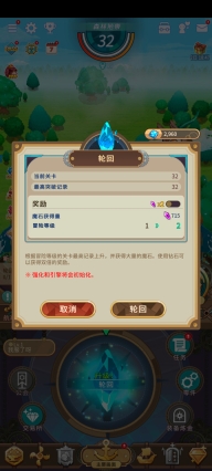 11、主要画面下方有个很大的蓝色轮回的水晶标识,这个轮回功能可以把你当前所有对角色的等级、飞艇的强化都归零,重新回到起点再对抗更高级的怪物获取更高级的资源再对角色、飞艇进行强化升级升星!