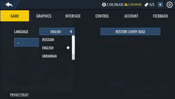 2、点击游戏右上角设置按钮,点击LANGUAGE即可切换语言,如俄文、英文等。