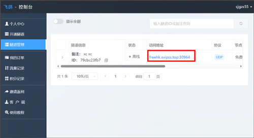 1、下载【飞鸽内网穿透器】。接着在飞鸽 - 控制台中,开通一个穿透隧道并进行设定,协议需选择为udp,端口设定为7777 。