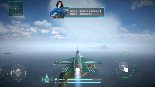 2、之后可以根据指引操作机器,左下方的圆圈是方向控制摇杆,可以先往左滑动。控制飞机向左飞行一段距离;