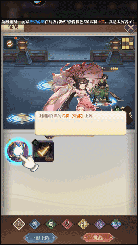 4、点击刚刚召唤出来的武将使其上阵,接着便开始挑战。