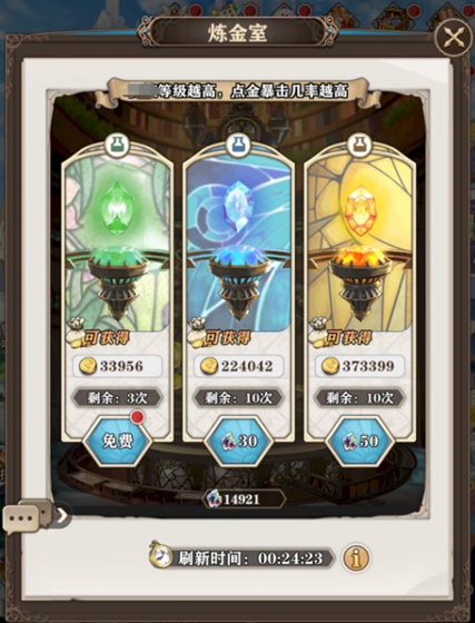 这大概是游戏里最方便的来钱途径了,进入的位置在屏幕最上方显示金币数的位置,点击加号即可进入到炼金室页面,在这里我们可以每日进行3次的免费炼金,也可以花费星石进行额外的炼金。这边实际上通过日常任务就可获得数量不少的星石,所以尤娜认为完全有条件可以直接连同隔壁的收费炼金一起吃掉(如果有必要的话)。