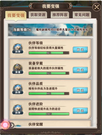 实际上游戏内也给了我们一定的指引办法,如果骑士大人到后面实在不清楚自己该做什么,可以重新回到探险页面,在探险按钮左侧就可以看到【我想变强】这个按钮,进入之后就会见到上图这个进度指引啦。