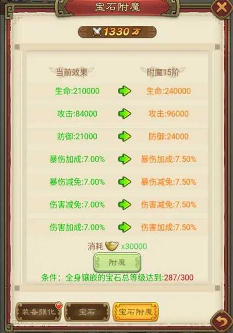 此外,宝石附魔是个不可忽视的强化手段,尽管它需要消耗元宝,但所带来的属性加成不容小觑。由于宝石附魔对宝石总等级有一定要求,因此推荐你先将宝石等级提升至一个相对较高的水平,然后再进行合成升级。