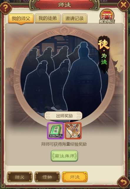 此外,还要提一提结义跟师徒。特别是师徒,在游戏初期一定要找到一位良师!完成师徒任务会提供巨量经验,这很重要!而收徒也可以获得威望,而在威望商店中兑换称号,实现师徒双赢。