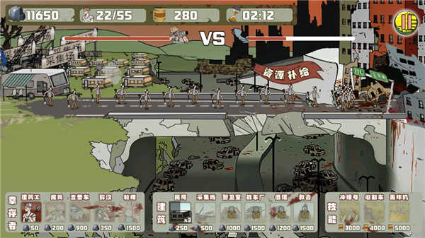 游戏界面顶端可以看到双方基地血量,派遣幸存者进攻;