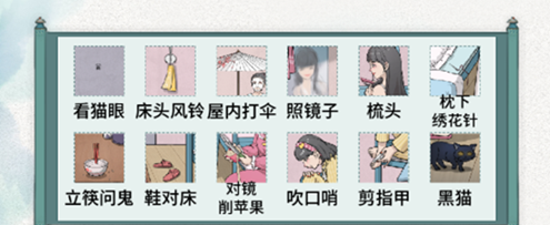 门上的猫眼、床头风铃、屋内打伞、照镜子、梳头、枕头下面的绣花针、桌子上的饭碗立着筷子、鞋对床、吹口哨、剪指甲、黑猫