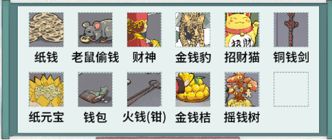 纸钱、老鼠偷钱、财神、金钱豹、招财猫、铜钱剑、纸元宝、钱包、火钱(钳)、金钱橘、摇钱树、彩票