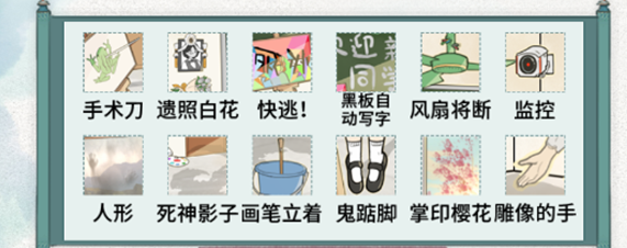 手术刀、遗照白花、快逃、黑板自动写字、风扇折断、监控、人性、死神影子、画笔立着、鬼垫脚、掌印樱花、雕像的手