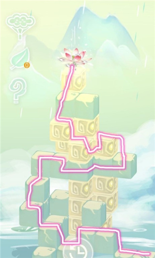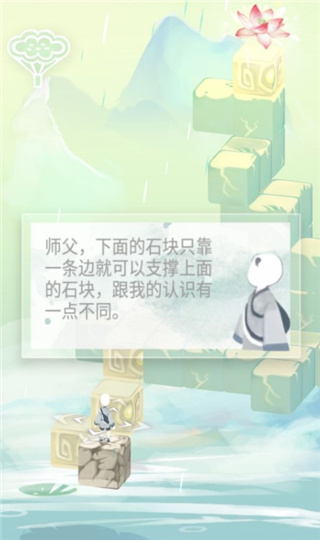 本作操作并不复杂,通过推、拉、边缘攀爬和爬行等方式到达最高处采摘莲花。长按石块可以滑动推开或拉近,若前方无路可走,则可通过边缘攀爬转移到另一侧继续前进。游戏玩法类似推箱子,需要玩家思考如何移动石块为自己开辟道路,但务必记住小和尚不能掉落悬崖,也不能被掉落的石块砸中,否则会直接导致游戏结束。