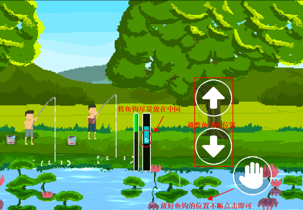 3、开始钓鱼小游戏后,可以将鱼钩放在中间位置,然后静等方块移动到位,玩家只需要一直点击右下角的按钮增加钓鱼值即可。钓到三条鱼后再与大宇对话,然后三个人开始玩木头人游戏。