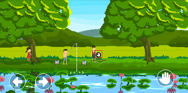 2、选择帮大宇钓鱼后继续向右移动到鱼竿处,在鱼竿上方出现对话图标后,点击右下角手印开始钓鱼。