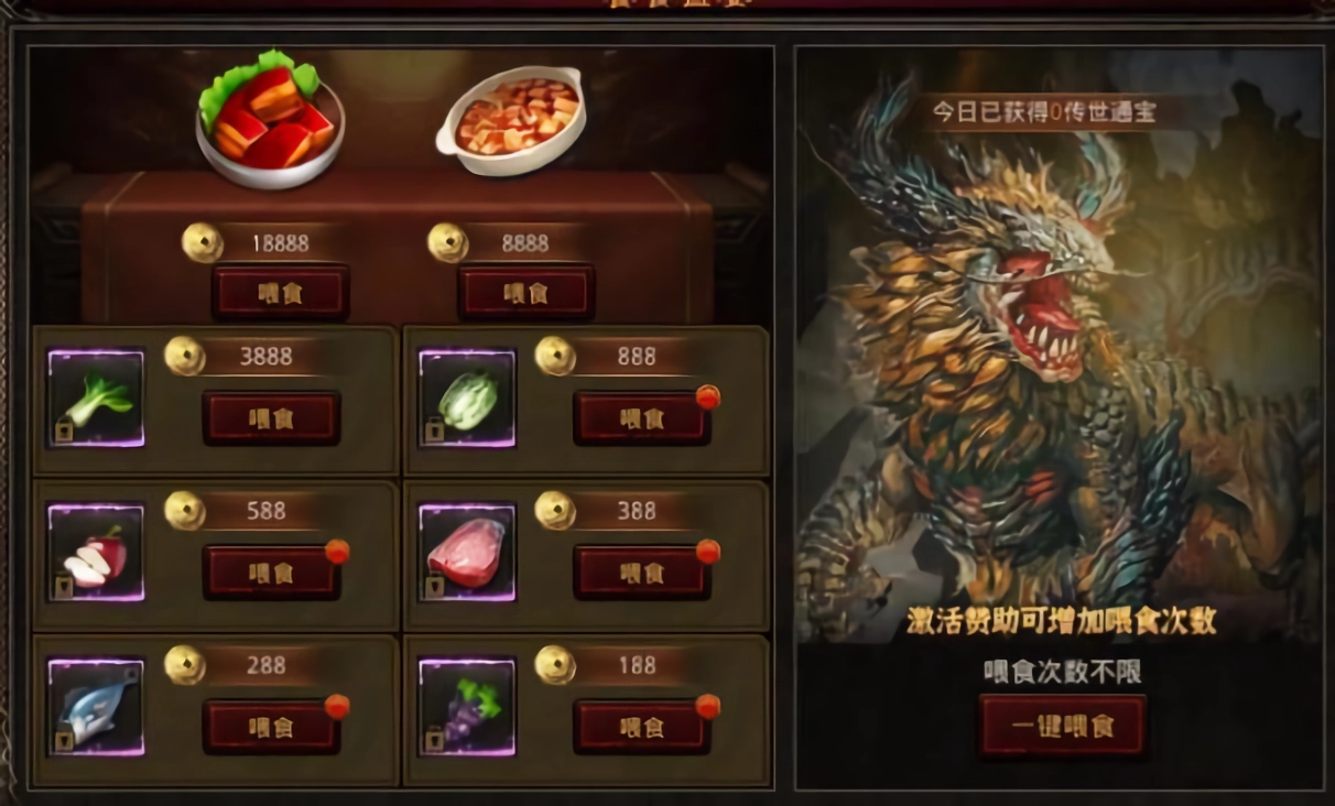 所有怪物都有几率掉落喂养道具,喂养饕餮可获得传奇通宝奖励,激活赞助可增加每日的回收次数,星耀赞助更是无限回收。勇士们还可通过游戏内-勤能补拙,每日通过击杀怪物数量获得超级福利红包。