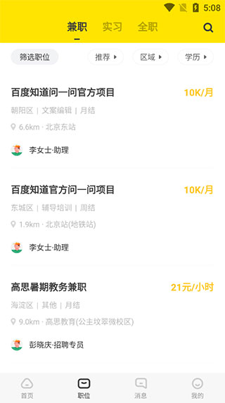 职位页面,你可以在线找兼职、实习、或者全职,也可以筛选职位。