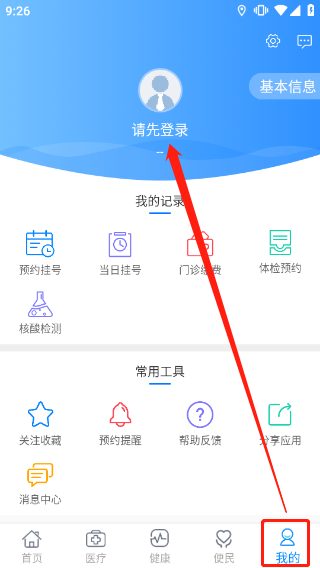 1、进入健康甘肃中点击菜单“我的”,点击上方的“请先登录”。