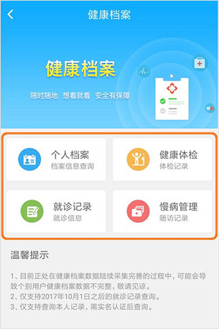 4、【档案查询】 个人健康档案,随时掌握自己的健康状态。
