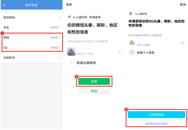 点击下方导航栏中“我”,点击“设置”—“账号安全”,点击“微信”/“QQ”即可自动跳转到微信或QQ,点击“授权并登录”即可。