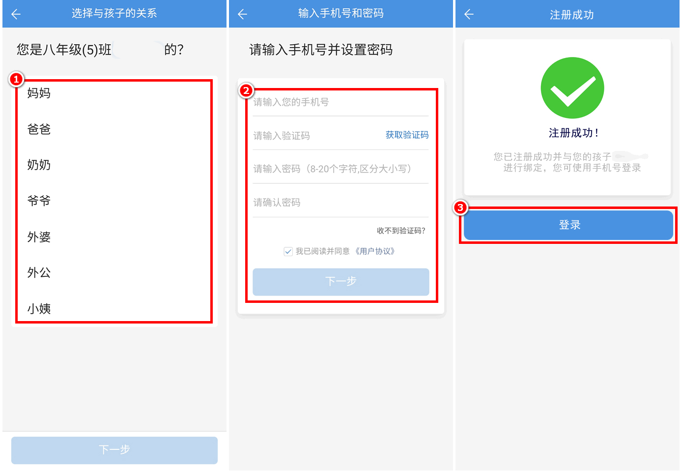 选择与孩子的关系,输入手机号码、验证码,设置密码,即可完成注册,点击登录即可自动登录啦