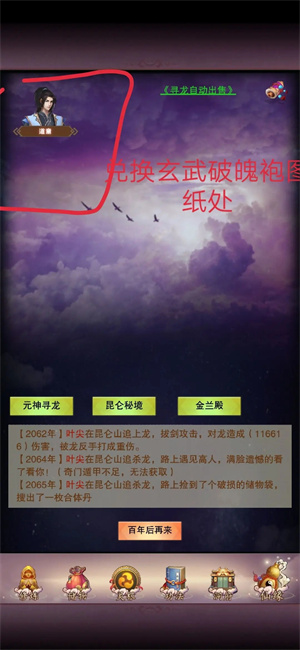 出窍后可以进昆仑寻龙(仙缘),左上角有道童,对话后可以用醉仙酿(红酒)换玄武破魄袍图纸。非常重要!建议从开始玩攒下的红酒优先用来换这个,出窍期基本上去二层换些心法就能刷刷图五(虽然可能不能刷通),从小怪身上也有极低概率出破魄袍。学了玄武破魄后,可以在炼器界面使用普通破魄袍炼制玄武破魄,普通破魄袍防御是40-50,而玄武破魄袍的防御是141-550,提升之大不用多说了吧?