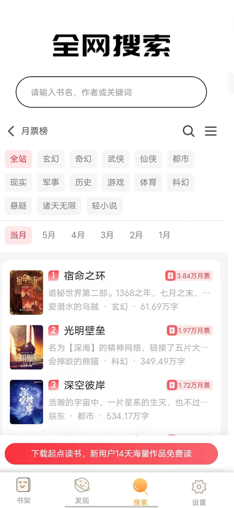 之后进入搜索界面,这个app里面可进行全网搜索小说。