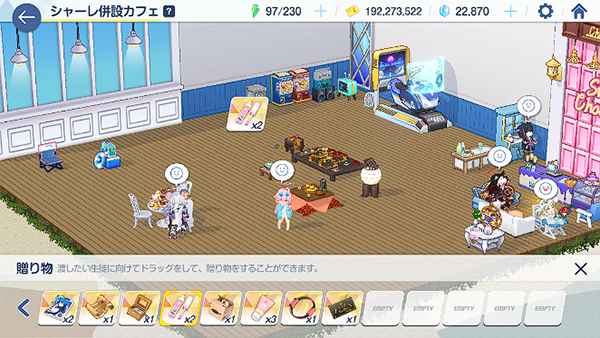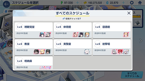 根据自己的需要安排学生的日程来获得好感度(必得)、技能升级材料(概率获得)和碎片(概率获得)