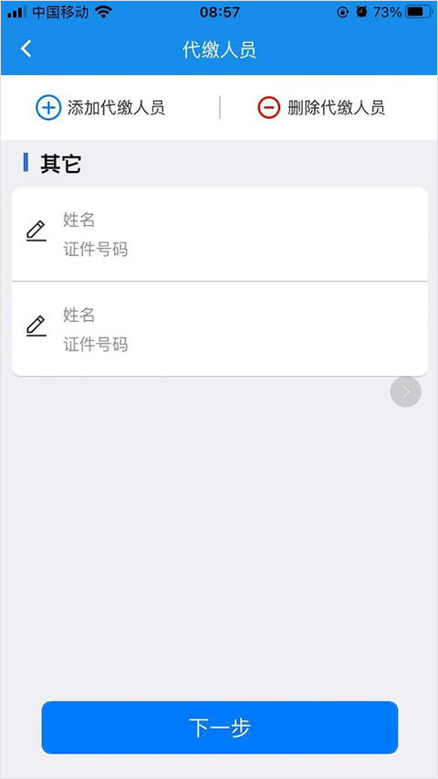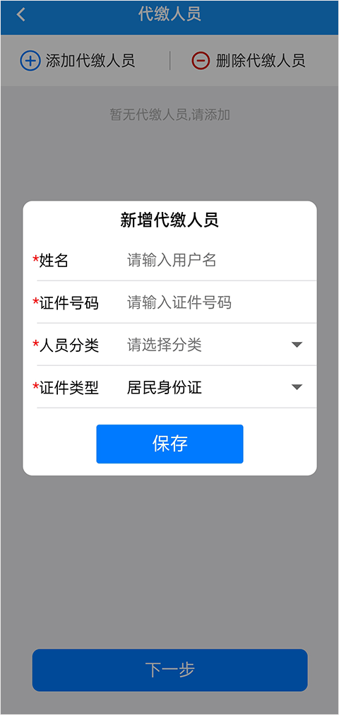 3、添加代缴人员,依次填写代缴人身份信息,并点击保存;