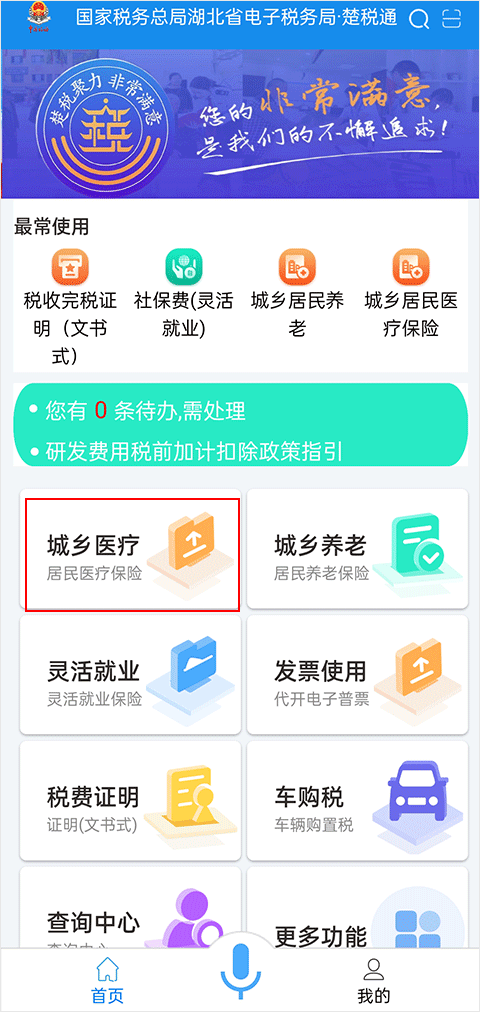 1、首先打开楚税通app,在首页,点击城乡医疗功能;