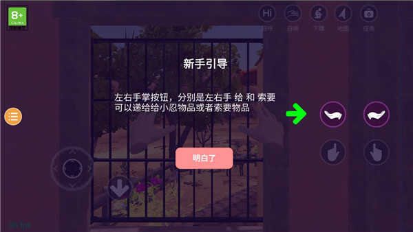 2、首先开启新手引导,左侧按钮是给予,右侧按钮是索要,你可以向小忍提供物品或索取物品;