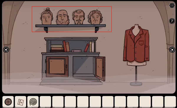 用锤子将钉子钉入墙壁再挂上镜子,再根据笔记本里的提示对着镜子使用小黑盒获得「眼球」,接着用钻头在石雕脑门上钻出凹槽放入眼球,在拿到嘴里的「剪刀」跟「钥匙」。