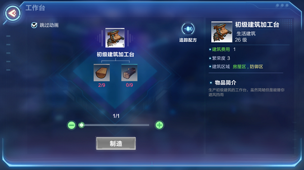 初级建筑加工台,需要材料:木材9,星灯木9。建筑加工台是制作所有建筑类物品的必经之路,也可以说有了初级建筑加工台才能继续制作后续的配方,可以说是最重要的配方之一。