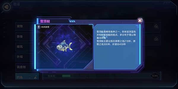 单独点击任意鱼类,可以查看捕捉区域,以及介绍。这里所列举的为稀有鱼类,正常钓鱼的情况下大概率会钓到海藻之类的副产品,所以想要收集图鉴,玩家需要足够的耐心,才能捕捉到心仪的鱼类。