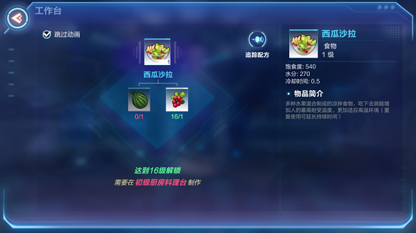 其次是西瓜沙拉,制作材料:西瓜1,红浆果1。饱食度+540,水分+270。可以有效的在炎热地带短时间抵抗炎热。
