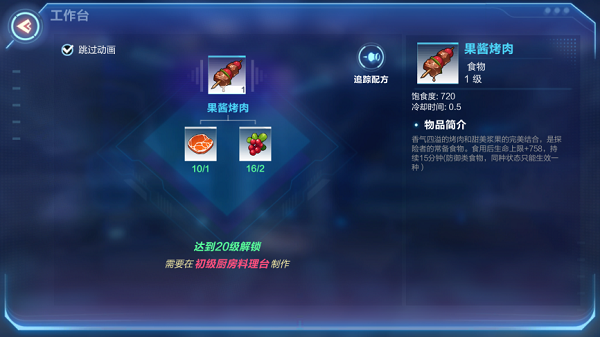 果酱烤肉,制作材料:兽肉块1,红浆果2。达到20级解锁。果酱烤肉属于战斗类食物,使用后可以生命上限+758,持续15分钟。饱食度+720。刷图过任务这可以说是必备品之一。