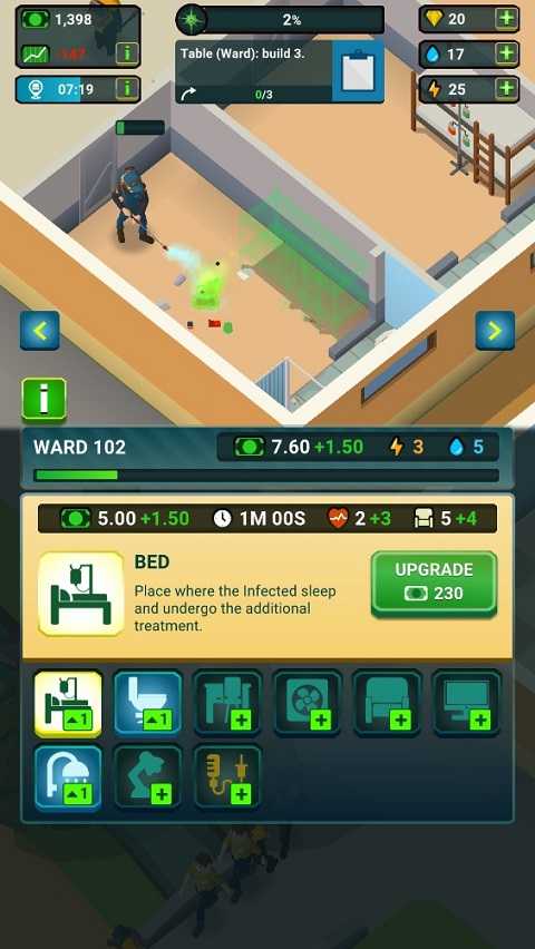 监视僵尸的状况,以防止爆发攻击。升级创建药品的实验室。保持诊所的建筑物清洁,安装优质淋浴器以改善卫生状况。该病毒严重影响了感染者的心理,他们需要娱乐才能治愈。将新电视放到病房,把长椅放到院子里,甚至买吉他在篝火旁玩音乐。这将帮助您的病人打败内在的野兽