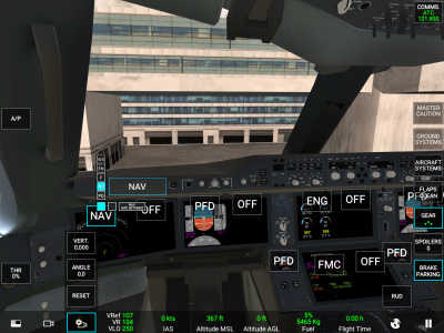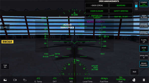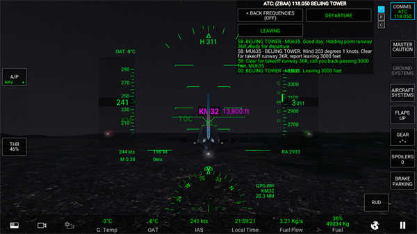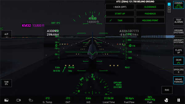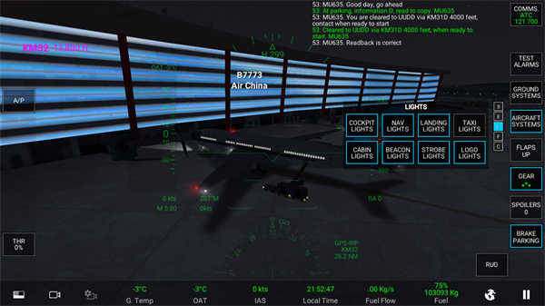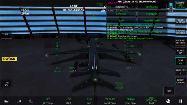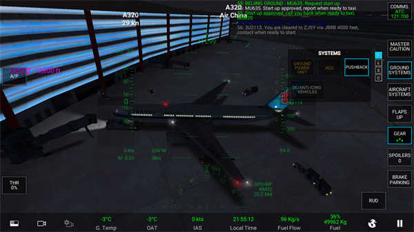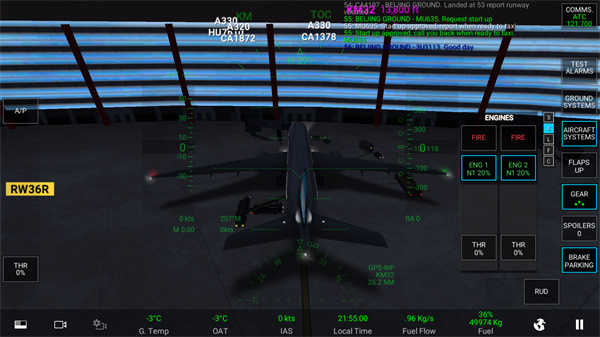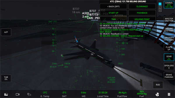 当显示绿色时,发动机就完全进入启动状态了,这时,向塔台申请移动飞机,等对话完毕后,点击地面辅助倒退车。