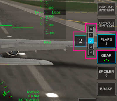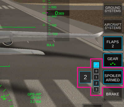 按下可伸出/收回起落架。确保 IAS(指示空速)低于“VLO”(最大起落架操作速度),以便延长它。