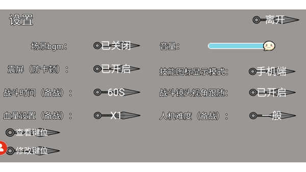 点击右上角设置按钮,玩家可调整游戏音量、键位等设置;