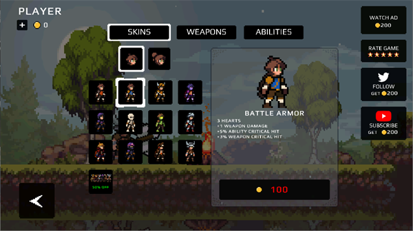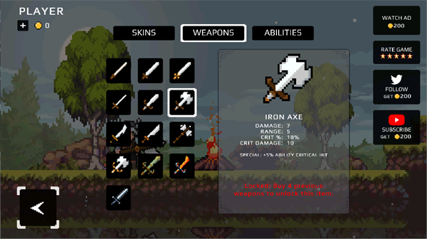 点击设置可以更换皮肤,切换武器,升级技能,不过这些都是要用金币来换取的。