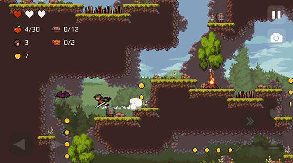 5、点击右下角的向上箭头可以跳跃,连续点击两次跳得更高。收集到的苹果和金币会在左上角显示,必须收集齐所有物品才能完美通关。
