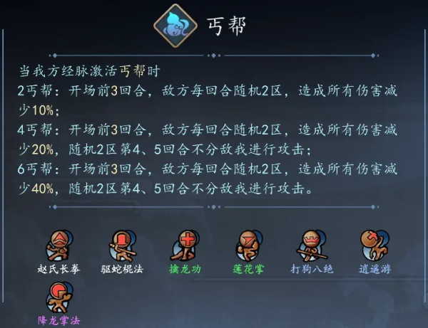 游戏共设五门派一散人,青城、大理、逍遥、少林、丐帮五门派及一散人,各具特色。武学路数:武学分为守、撩、荡、辅、平、离六种战斗路数,适应不同的战术布局。释放机制:武学分为主动释放、追击触发及前置准备三类,战斗中速度决定行动顺序,相同速度则随机决定。武学的“气量”属性可为所在区块提供生命值支持。
