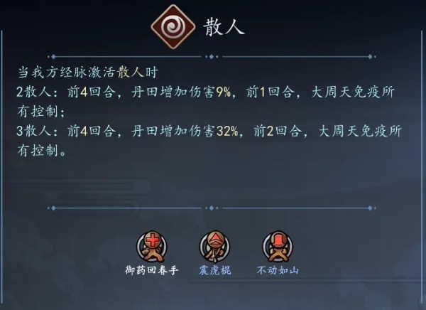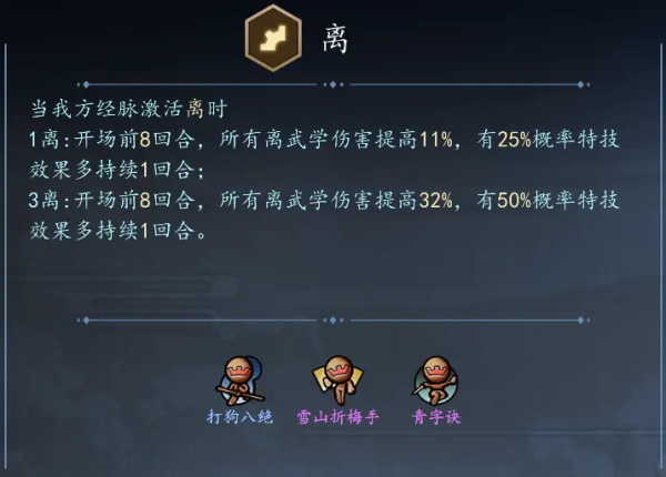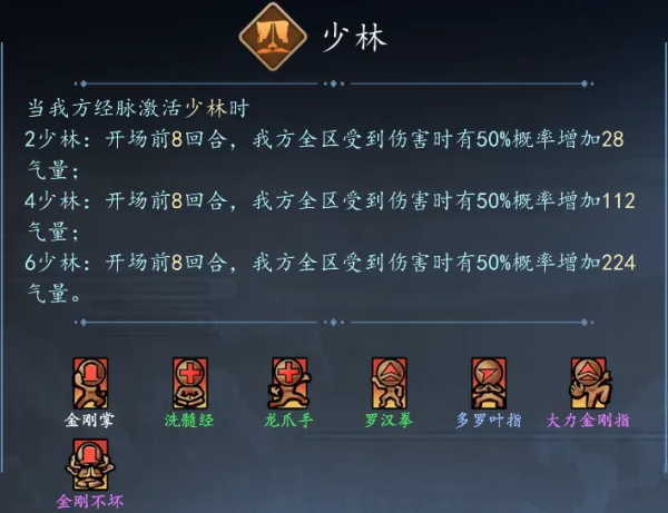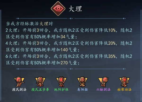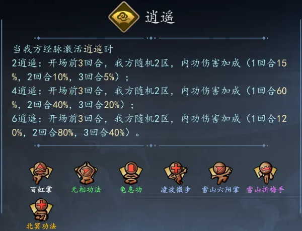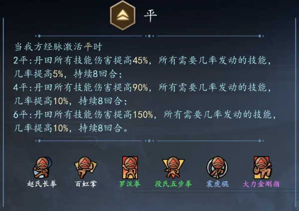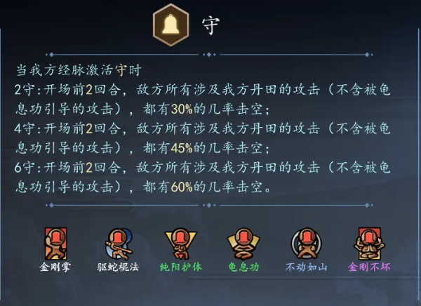 每回合自动增长并可通过特殊货币“红玉”加速升级,解锁丹田、小周天及大周天位置,用于部署武学。丹田等同于角色生命值,即丹田毁则角色亡。五行搭配:每个武学对应五行亲和度,合理搭配能显着提升攻防效果,分别为S、A、B、C四级评分,S级为原属性增强20%,A级为原属性不变,B级为原属性减弱15%,C级为原属性减弱25%。五行亲和度可在准备阶段无代价任意更换。羁绊效应:依据武学所属门派与路数,组合同门派或同路数武功可激活羁绊加成,策略布阵至关重要。