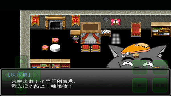 来到大厅,看看灰太狼在和羊羊们解释什么,靠近后点击右下角。