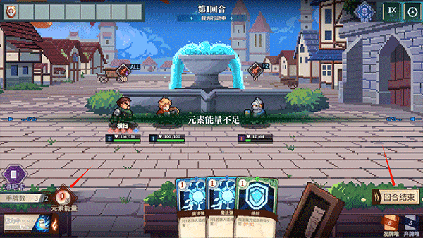 每个卡牌上会显示需要消耗的能量点,当左边能量点显示为0时,需要点击回合结束