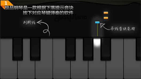 极品钢琴是一款根据下落提示音块,按下对应琴键弹奏的游戏,琴键上方的黑线就是判断线,游戏过程中吊线音块需要先按,也就是说,该音块会率先到达判断线处,当音块密集的时候,方便玩家判断。按完该音块之后,就会生成第二个吊线音块,这也算是游戏的一个小提示。