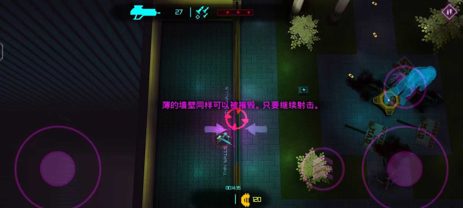薄的墙壁同样可以被摧毁,只要继续射击;