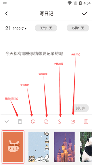 写日记时,可以选择自己喜欢的日记封面、信纸背景、字体样式和颜色等等。
